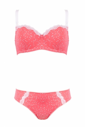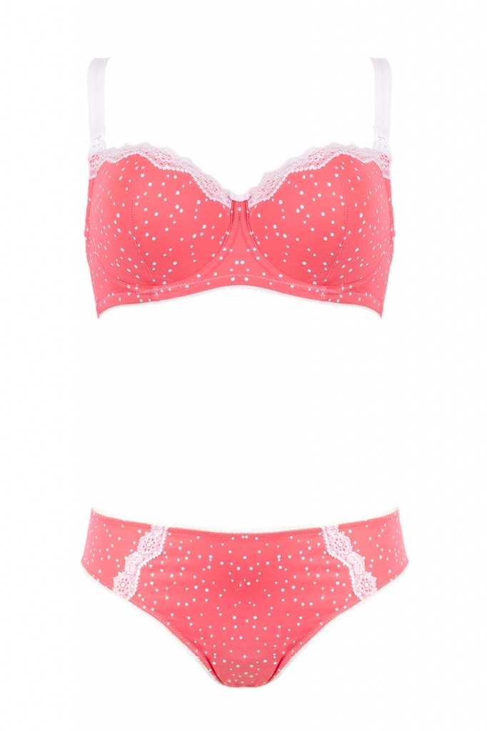 Biustonosz stworzony z myślą o mamie karmiącej, wykonany z pięknej dzianiny w groszki. Delikatny landrynkowy kolor współgra z okalającą miseczki białą koronką. Wnętrze miseczek wykonane jest z bawełny. Staniczek jest miękki na fiszbinie. Biustonosz wspaniale sprawdzi się podczas karmienia dzięki wygodnie odpinanym klipsom Clic-Clac umożliwiającym odpięcie i zapięcie miseczki jedną ręką, a tym samym karmienie dziecka bez zdejmowania biustonosza. Ramiączka regulowane, szerokość ramiączek dopasowana jest do wielkości miseczek. Do kompletu proponujemy figi.