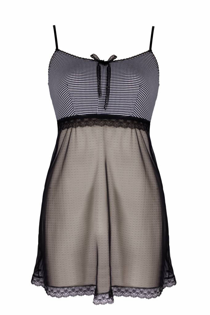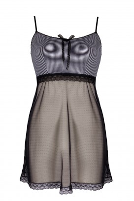 Kobieca koszulka pełna niewinności oraz lekkości.Góra koszulki utrzymana w tradycyjnych barwach połączenia bieli z czernią, urzeka pięknym wzorem drobnej pepitki. Dół i tył koszulki wykonany z subtelnego, zwiewnego tiulu. W komplecie oferujemy skąpe czarne stringi.