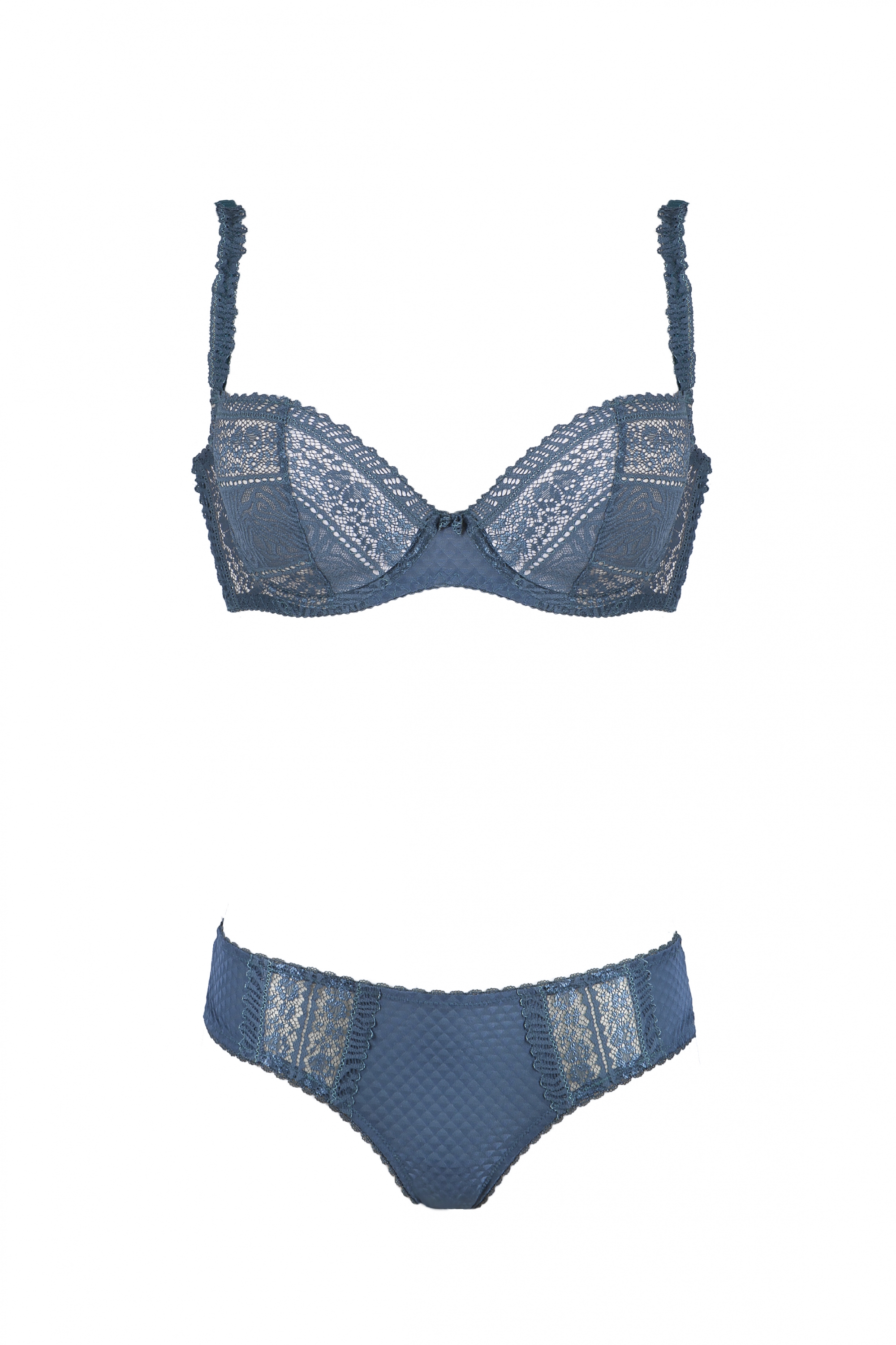 Urzekający elegancją model typu soft. Konstrukcja tego biustonosza pozwala wyeksponować naturalny kształt biustu, a tym samym nadaje delikatności i wdzięku. Fascynująca koronka na miseczkach nadaje mu nietuzinkowego uroku. Między miseczkami delikatna kokardka dodająca uroku całości. Ramiączka nie odpinane, regulowane. Do kompletu polecamy spodenki w tej samej kolorystyce z tyłu ozdobione wytworną koronką.