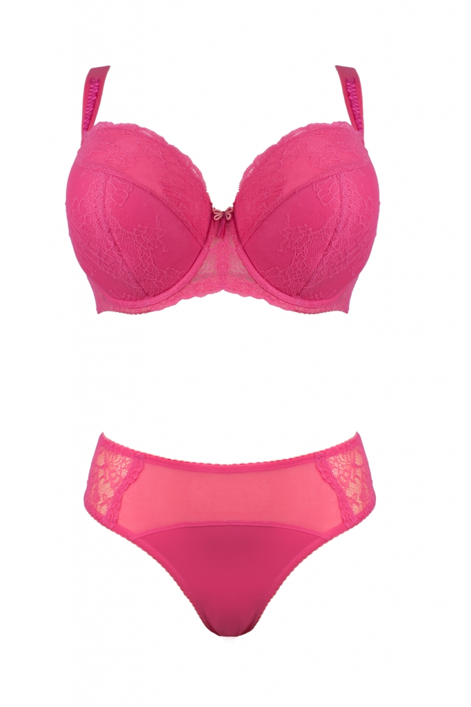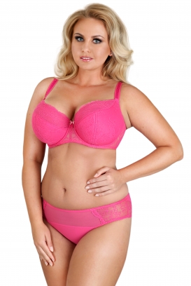 Piękny biustonosz z fiszbinami utrzymany w amarantowej kolorystyce. Model półusztywniany - semi soft, przeznaczony dla pań hojniej obdarzonych przez naturę. Wyśmienicie zbiera piersi i utrzymuje je na właściwym miejscu. Górna część biustonosza jak i dolna pokryta jest koronką. Biustonosz posiada regulowane ramiączka. Szerokość ramiązcek i rodzaj zapięcia dopasowany jest do rozmiaru biustonosza. Do skompletowania idealnej całości polecamy wyższe figi w tym samym deseniu kolorystycznym.
