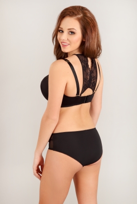 Wyjątkowy w czarnej ponadczasowej kolorystyce soft z najnowszej kolekcji. Wzbogacony o fiszbiny, wykonany z połączenia gładkiej dzianiny i wytwornej siateczki. Miseczki z odpowiednimi cięciami, świetnie zbierają piersi, unoszą je i odpowiednio modelują. Ramiączka regulowane, odpinane. Dodatkowym jego atutem jest trzecie, ramiączko typu straps. Sprawia, że dekolt wygląda intrygująco. Na plecach ozdobna koronka, która sprawia, że poczujesz się wyjątkowo. Polecamy figi do skompletowania idealnej całości.