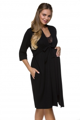 Niezbędnik każdej przyszłej mamy, zwłaszcza na czas pobytu w szpitalu i później, w czasie opieki nad maluszkiem. Może posłużyć Ci jako szlafrok lub okrycie do szpitala. Mięciutki, wysokogatunkowy materiał, zachowany w ponadczasowej eleganckiej czerni, pięknie dopasowuje się do każdej wielkości brzuszka. Rękawki szlafroczka 3/4. Szlafrok wiązany w pasie.