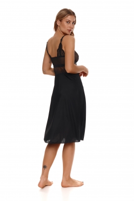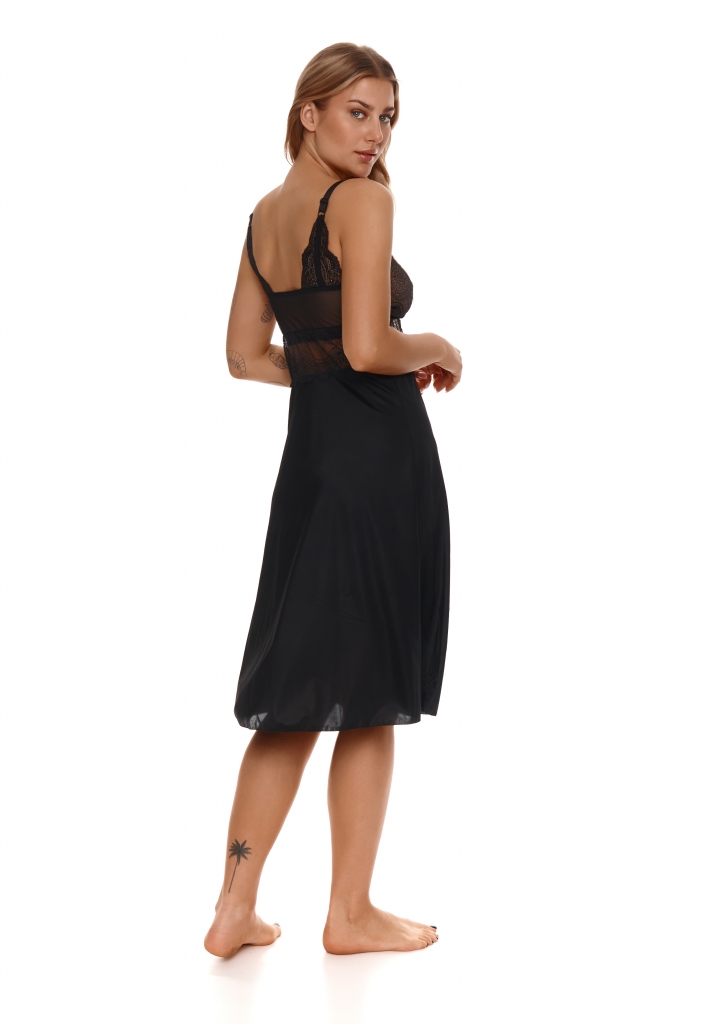Koszulka nocna, miękka, bez fiszbin stworzona z myślą o kobietach hojniej obdarzonych przez naturę. Góra koszulki wykonana z połączenia cielistej siatki i czarnej koronki. Dół rozkloszowany z czarnej wiskozy, długość do połowy łydki. Dekolt zdobi delikatna kokardka z mieniącą się ozdobą. Ramiączka regulowane, nieodpinane, na łączeniu z przodu z koszulką również ozdobione kokardkami, z tyłu zaś ramiączko dodatkowo ozdabia koronka.