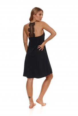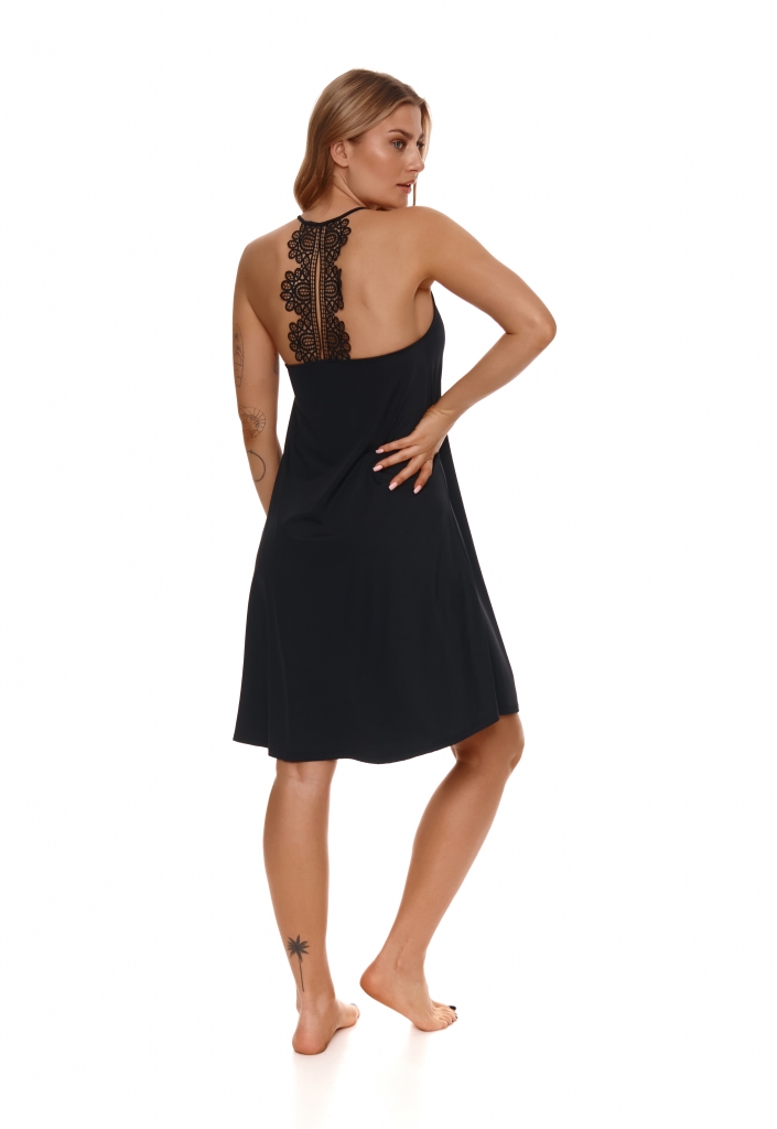 Czarna, klasyczna a zarazem elegancka koszulka idealna dla kobiet ceniących szyk i wygodę w jednym. Przód gładki, rozkloszowany, długość do kolana. Ramiączko regulowane, połączone z gipiura znajdującą się na plecach, która nadaje całości niepowtarzalnego charakteru.