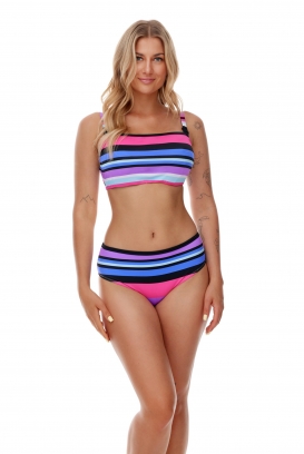 Kostium kąpielowy, przeznaczony na duże biusty, wykonany z mikrofibry w kolorowe paski poziome. Góra kostiumu w formie opaski. Ramiączka regulowane nieodpinane. Szerokość ramiączek i typ zapięcia dopasowany do rozmiaru kostiumu.