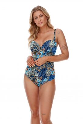 Jednoczęściowy kostium wykonany z dzianiny w stylu Versace w niebieskim odcieniu. Stworzony dla kobiet z mniejszym lub średnim biustem, doskonały do użytku zarówno na plażę jak i na basen. Fason stroju łączy funkcjonalność oraz elegancję. Kostium posiada miski z żelową wkładką push-up na fiszbinie świetnie zbierają i uwydatniają biust. Miedzy miseczkami subtelna ozdoba. Ramiączka nieodpinane, regulowane. Tył kostiumu zapinany na klamrę.