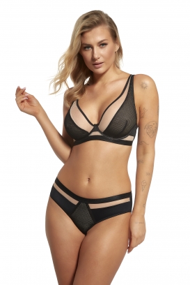 Wyjątkowy, kokieteryjny, biustonosz typu soft, zachwyca swoją delikatnością, zwiewnością oraz klasyką. Model zachowany w kolorystyce beżowo czarnej. Miseczki wykonane z połączenia siatki oraz delikatnej kabaretki, idealnie zbierają i modelują średnie i większe biusty. Między miseczkami subtelna kokardka. Ramiączka regulowane, nieodpinane.
