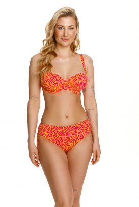 Przepiękny kostium w typowo wakacyjnej kolorystyce. Model zachwyca kolorystyką. Barwy, które tutaj dominują to żółty i pomarańczowy. Góra kostiumu posiada miękkie miseczki z modelującymi cięciami oraz jest usztywniony fiszbinami, dzięki czemu doskonale podtrzymuje średnie i duże biusty. Ramiączka regulowane, nieodpinane. Szerokość ramiączek i typ zapięcia dopasowany do rozmiaru kostiumu. Miedzy miseczkami delikatna ozdoba dodająca uroku całości. Idealna propozycja dla kobiet o pełniejszych kształtach.