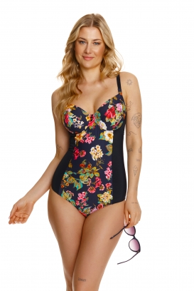 Jednoczęściowy kostium wykonany z dzianiny z motywem kolorowych kwiatów, doskonały do użytku zarówno na plażę jak i na basen. Fason stroju łączy funkcjonalność oraz elegancję. Kostium posiada wszyty biustonosz z miękkimi miseczkami na fiszbinach oraz regulowane, nieodpinane ramiączka. Szerokość i typ ramiączek dopasowane do rozmiaru kostiumu. Wstawki z czarnego materiału po bokach optycznie wyszczuplają i modelują sylwetkę. Tył kostiumu zapinany na klamrę.
