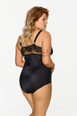 Body Model 259 to kwintesencja zmysłowości w eleganckim wydaniu. Górę zdobi koronkowa siatka na beżowej dzianinie, urozmaicona sensualnym rozcięciem na biuście. Pod piersiami znajduje się odcięcie z tasiemki ozdobionej biżuteryjnym, złotym akcentem. Poniżej materiał przechodzi w transparentną siatkę na brzuchu, nadając całości lekkości i odważnego charakteru. Zmysłowa jest również górna część pleców, utrzymana w transparentnym koronkowym wykończeniu. Model na cienkich ramiączkach doskonale sprawdzi się zarówno jako wyrafinowana bielizna, jak i efektowna propozycja na wieczór.