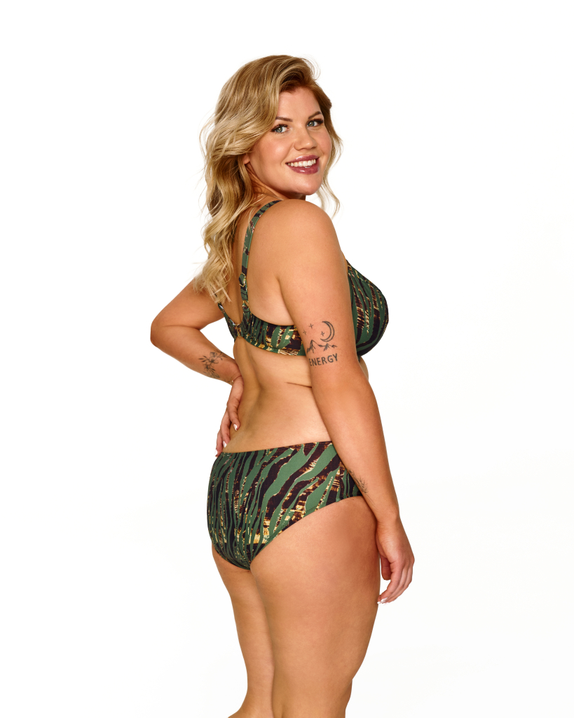 Figi z wyższym stanem subtelnie modelują brzuch i biodra, zapewniając poczucie swobody oraz pewności siebie. Klasyczny krój optycznie wysmukla sylwetkę, a elastyczny materiał dopasowuje się do ciała bez uczucia ucisku. Całość zdobi modny, tropikalny wzór w odcieniach zieleni i czerni, który przyciąga wzrok i pięknie komponuje się z opaloną skórą.